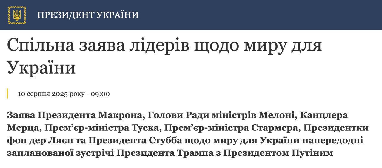 06:53 Лидеры Франции, Италии, Германии, Польши, Великобритании и Финляндии, а также Еврокомиссии сделали официальное заявление накануне переговоров Путина и Трампа.