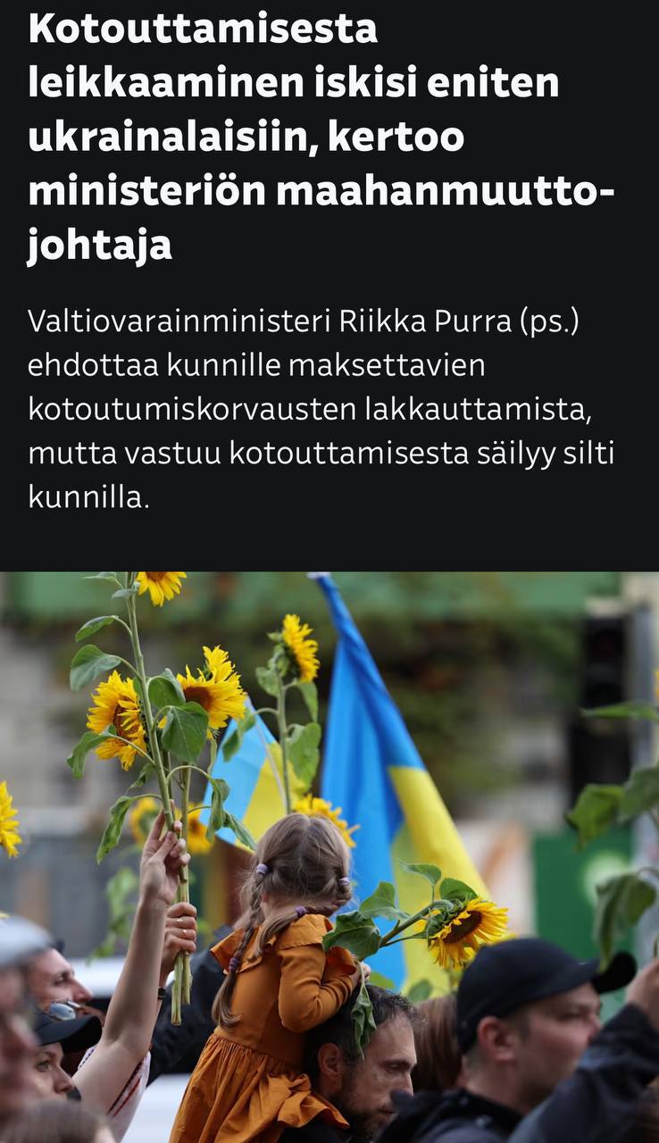 В Финляндии сейчас находится около 46 тысяч украинцев, на которых выделяется 317 млн евро помощи в год. Министр финансов Рийкка Пурра предложил сэкономить эти деньги за счет отмены выплат в течении следующих двух лет.