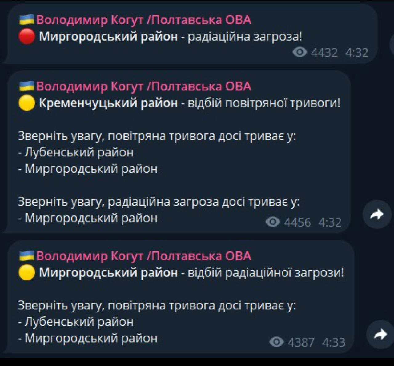 Такое сообщение появилось телеграм-канале губернатора. Заявлялось, что радиационная угроза обнаружена в Миргородском районе.