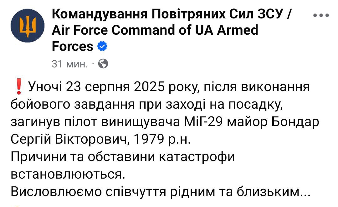 13:06 Разбившийся при посадке пилот МиГ-29, майор Сергей Бондарь, служил в 40 бригаде тактической авиации, известной как "Призрак Киева".