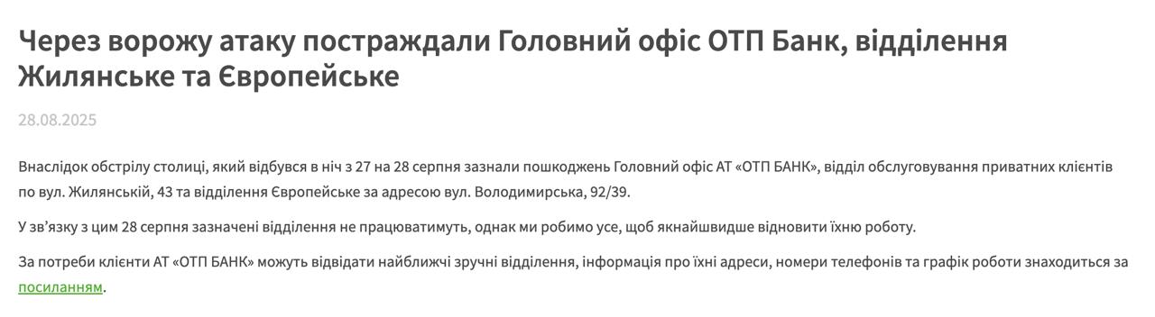 10:58 В районе Жилянской в центре Киева обстрелом повреждены офисы двух банков - Кредит Днепро и ОТП.