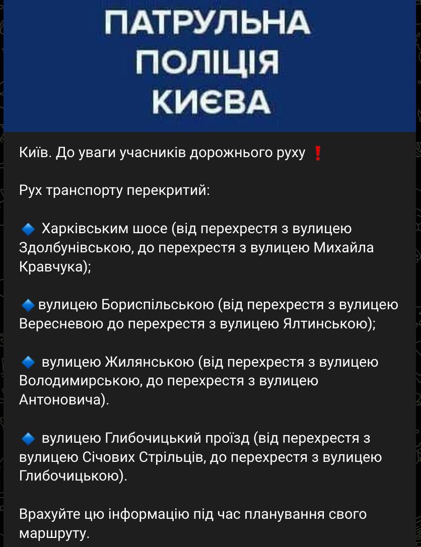 07:53 В Киеве перекрыли часть улиц после ночного массированного обстрела - как в центре, так и на левом берегу (район Харьковского шоссе и Бориспольской).