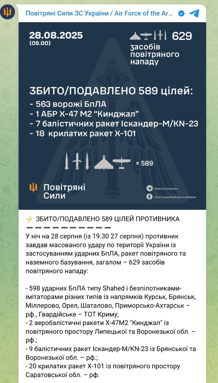 09:35 Украину ночью атаковали 598 БПЛА, включая "Шахеды", и 31 ракета. Были прилеты в 13 локациях.