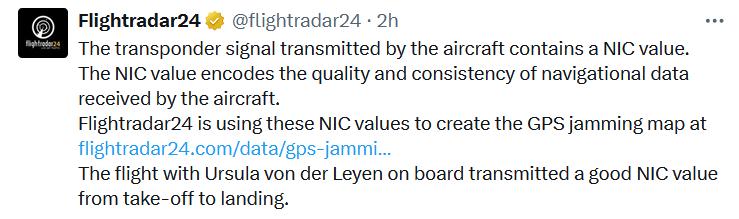 "Рейс с Урсулой фон дер Ляйен на борту передавал хорошее качество (сигнала) от взлета до посадки", – заявляет Flightradar.
