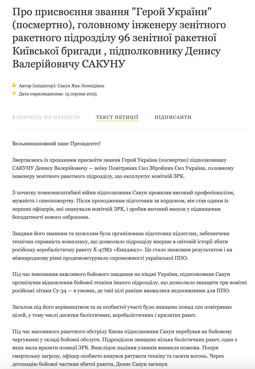 "Во время массированного ракетного обстрела Киева подполковник Сакун находился на боевом дежурстве в составе боевого расчёта. Подразделением было уничтожено несколько баллистических ракет, одна из которых должна была поразить позиции ЗРК. В результате падения обломков возник пожар. Несмотря на смертельную угрозу, офицер лично бросился спасать технику и тушить огонь. Из-за детонации боевой части сбитой ракеты Денис Сакун погиб", - говорится в петиции.