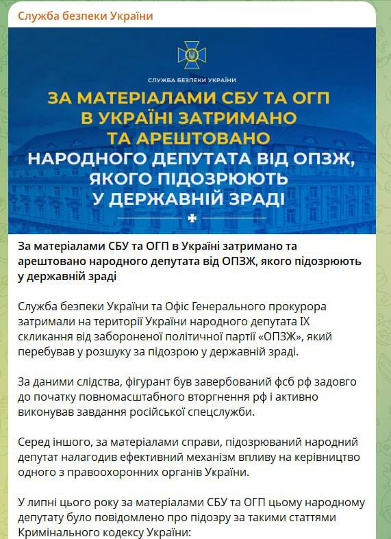 Служба безопасности Украины (СБУ) сообщает о задержании и об аресте народного депутата от запрещенной партии "Оппозиционная платформа - За жизнь" (ОПЗЖ).