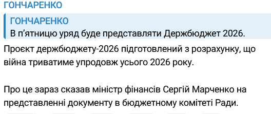 Слова Марченко на заседании бюджетного комитета Верховной Рады приводит в своем телеграм-канале народный депутат (партия "Евросолидарность") Алексей Гончаренко.