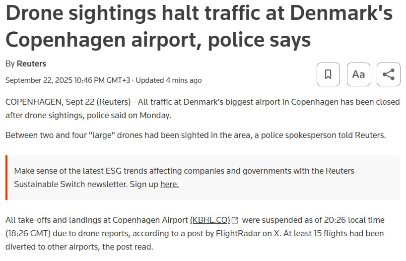 "Аэропорт Копенгагена закрыт из-за беспилотников... От двух до четырех „крупных“ беспилотников замечено в районе вокруг аэропорта Копенгагена", — цитируетагентство сообщение полиции.