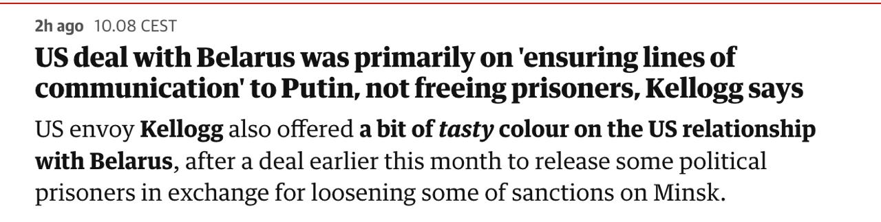 Спецпредставитель США по вопросам Украины и России Кит Келлог подтвердил, что Белый дом через президента Беларуси Александра Лукашенко ведет переговоры с главой Кремля Владимиром Путиным, и снятие санкций с Беларуси рассматривалось в этом ключе, а не для освобождения политических заключенных.