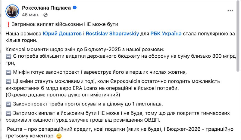 После того как многие СМИ привели слова главы бюджетного комитета о проблемах с выплатами зарплат военнослужащим она опубликовала пост в Фейсбуке с опровержением. Но при этом Пидласа признала, что денег в бюджете не хватает, поэтому в первых числах октября Минфин подаст в Раду законопроект об увеличении расходов на оборону на 300 миллиардов гривен.