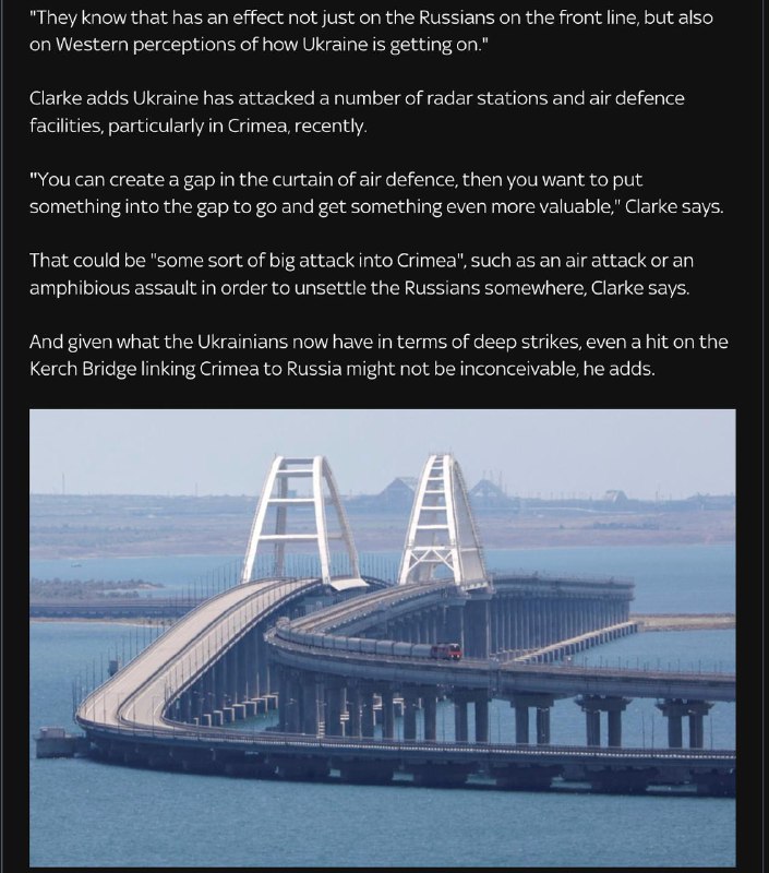 08:44 Украина может предпринять крупную атаку на Крым, например, попытаться высадить там десант или ударить по Керченскому мосту, заявил военный эксперт Майкл Кларк в эфире Sky News.