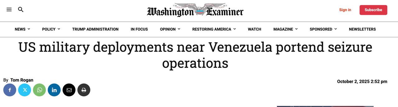 "Действительно, как стало известно изданию Washington Examiner, военные стратеги считают, что собранных сил теперь достаточно для захвата и удержания на территории Венесуэлы ключевых стратегических объектов, таких как порты и аэродромы (издание Washington Examiner не разглашает некоторые подробности по соображениям национальной безопасности). Контроль США над такими объектами позволит увеличить и поддерживать постоянное присутствие американской военной мощи в Венесуэле с обороняемых позиций", - говорится в статье.