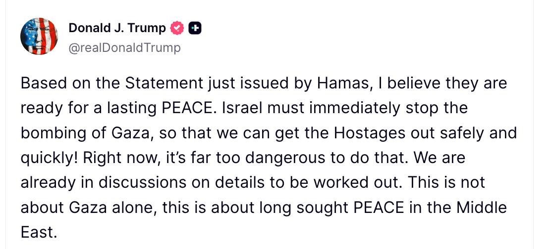"Израиль должен немедленно прекратить бомбардировки Газы, чтобы мы могли безопасно и быстро вывести заложников! Прямо сейчас это слишком опасно. Мы уже ведём обсуждения деталей, которые предстоит проработать. Речь идёт не только о Газе, а о давно ожидаемом мире на Ближнем Востоке", - написал президент США в своей соцсети.