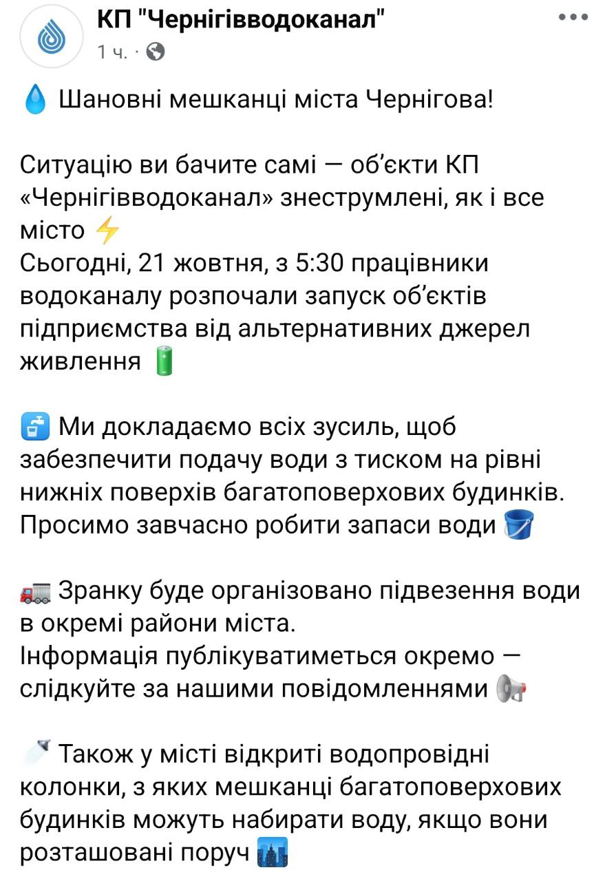 Об этом сообщает КП "Черниговводоканал" в Facebook.