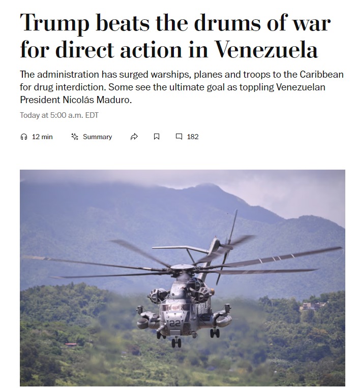 The Washington Post напомнила, что в Карибское море переброшены десятки военных кораблей и самолётов США, а также тысячи американских военнослужащих в рамках объявленного Трампом "вооружённого конфликта" с наркокартелями, которые он назвал международными террористами. В результате авиаударов США было уничтожено по меньшей мере семь судов, которые, по словам Трампа, перевозили из Венесуэлы наркотики в Соединённые Штаты в международных водах, в результате чего погибли десятки предполагаемых наркоторговцев.