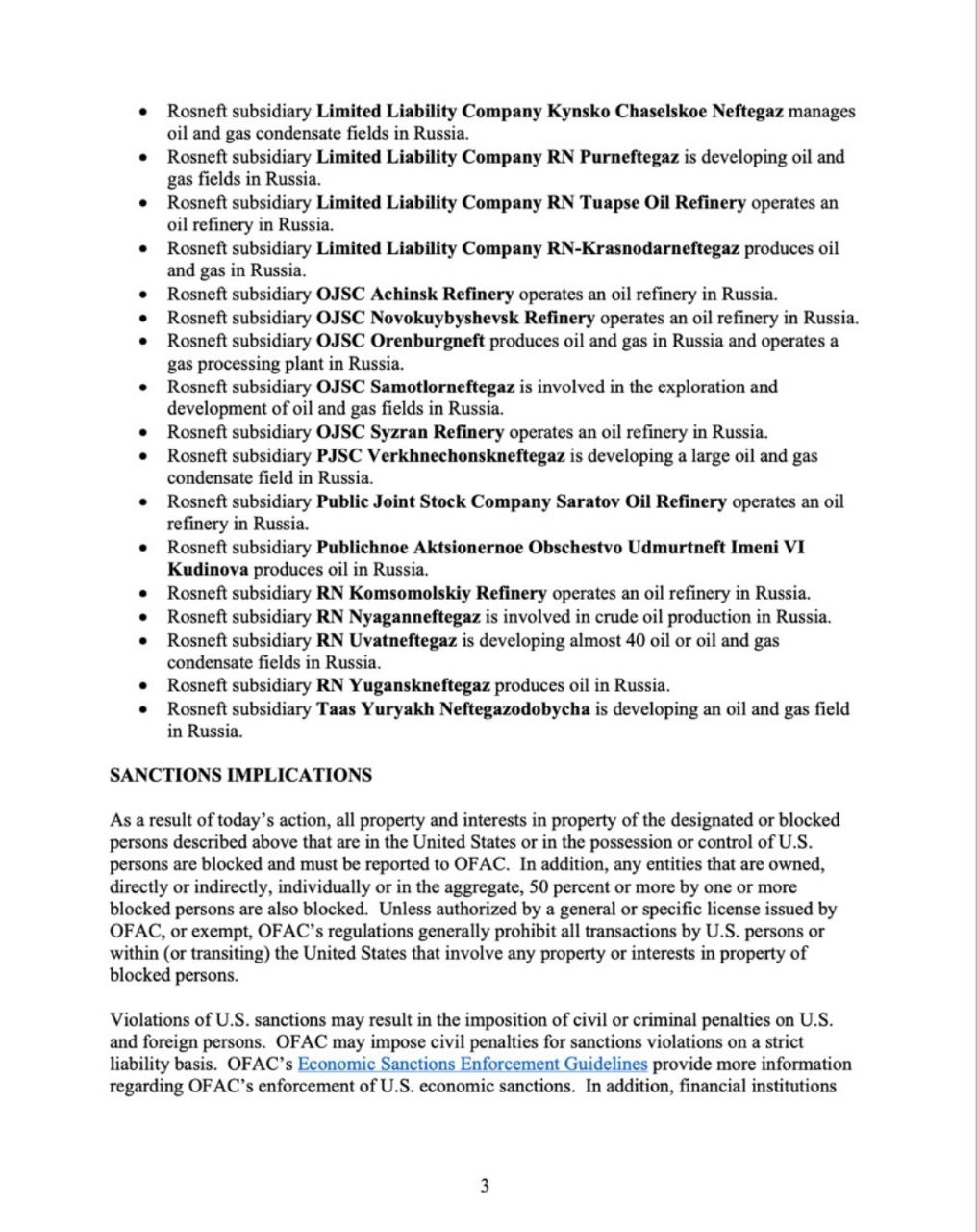 В приложении к документу перечислены десятки предприятий - добывающих, перерабатывающих и транспортных, включая крупные российские нефтеперерабатывающие заводы и производственные филиалы.