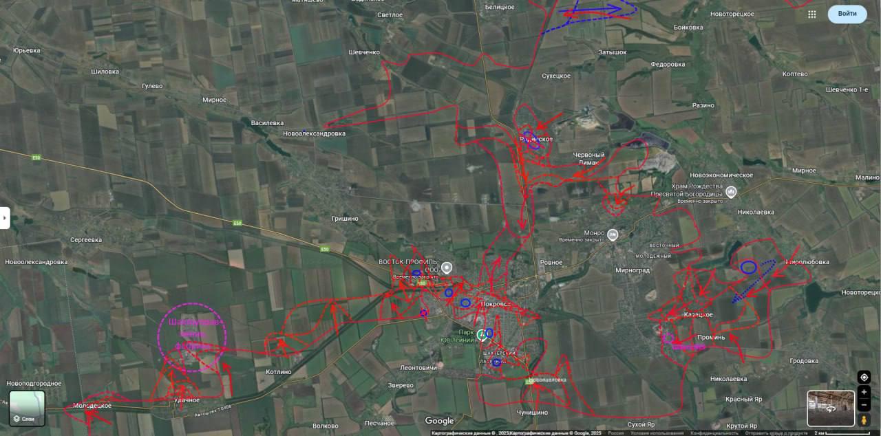 К востоку от Покровска усиливается российское наступление на Мирноград. Россияне заявляют о захвате там села Проминь, а немецкий военный обозреватель Юлиан Репке - о потере Украиной Новоэкономического и Николаевки (ничего этого Киев не подтверждал). Также российские и ряд украинских военных пабликов пишут и о боях в самом Мирнограде в районе шахты 5/6.