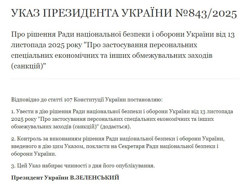 "Срок применения санкций - три года (а для лишения наград бессрочно). Запрета на въезд нет. Стандартный набор и срок санкций, включая полную блокировку активов (мгновенный эффект). Применено к лицам с подтвержденным иностранным гражданством", – сказал Власюк, чьи слова приводит Центр противодействия дезинформации при СНБО.