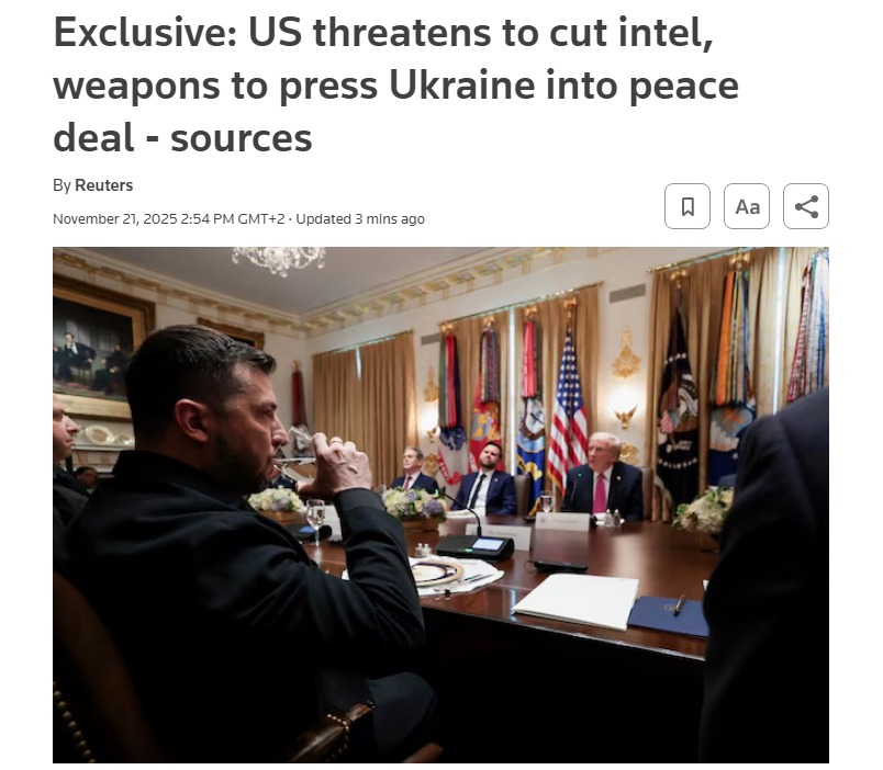Соединенные Штаты Америки пригрозили прекратить обмен разведывательными данными и поставки оружия Украине, чтобы заставить ее согласиться на рамочное мирное соглашение, заключенное при посредничестве Вашингтона.