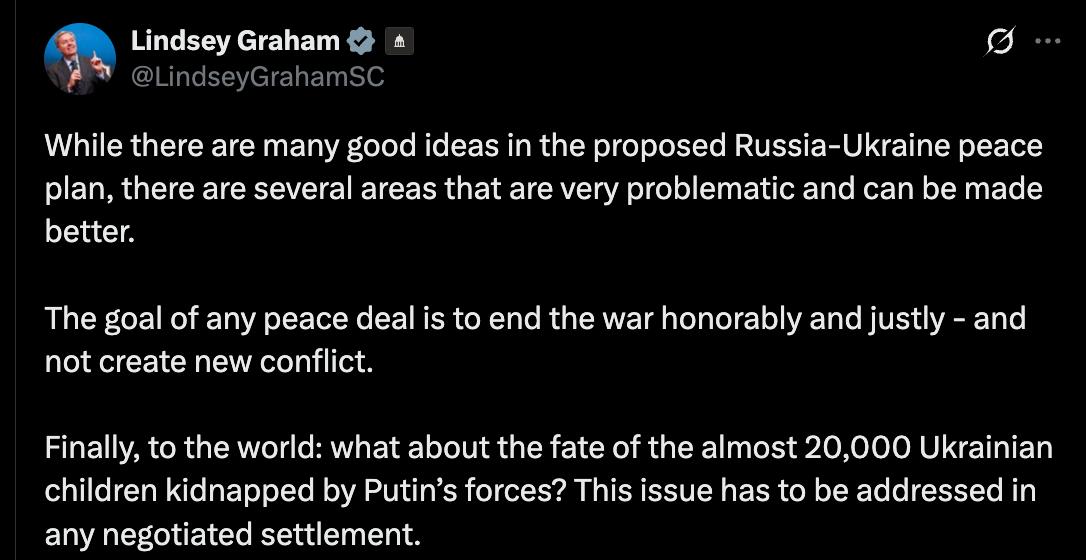 Позже Грэм смягчил свою позицию об украинском плане Трампа. Он написал новый пост, откуда убрал прежние призывы поменять этот план.
