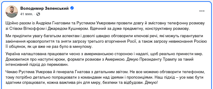 Президент Украины Владимир Зеленский провёл телефонный разговор со спецпредставителем президента США Стивеном Уиткоффом и зятем Дональда Трампа Джаредом Кушнером.