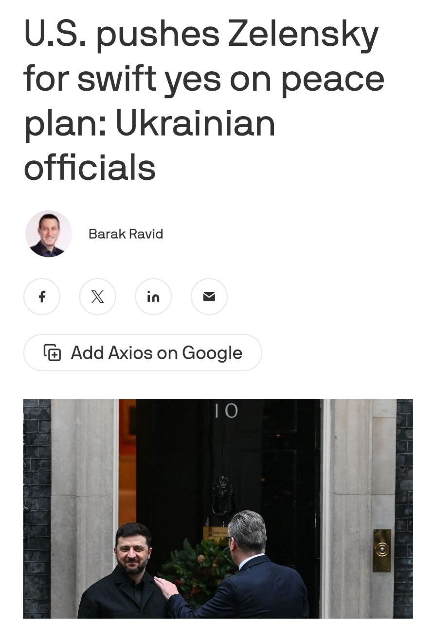 7.58 США давят на Зеленского, чтобы он принял "крупные территориальные потери и другие уступки", пишет издание Axios со ссылкой на источники.