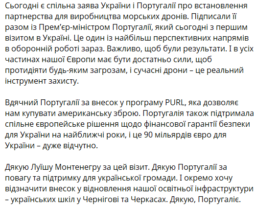 "Благодарен Португалии за вклад в программу PURL, которая позволяет нам приобретать американское вооружение. Португалия также поддержала совместное европейское решение о финансовых гарантиях безопасности для Украины на ближайшие годы, и это 90 миллиардов евро для Украины - очень ощутимо", - написал Зеленский в своем телеграм-канале.