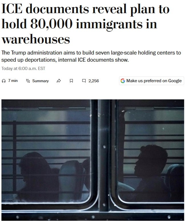 "Администрация Трампа ищет подрядчиков, которые помогут ей изменить систему содержания иммигрантов в США. План включает реконструкцию промышленных складов для содержания более 80 тысяч иммигрантов одновременно", - говорится в статье.
