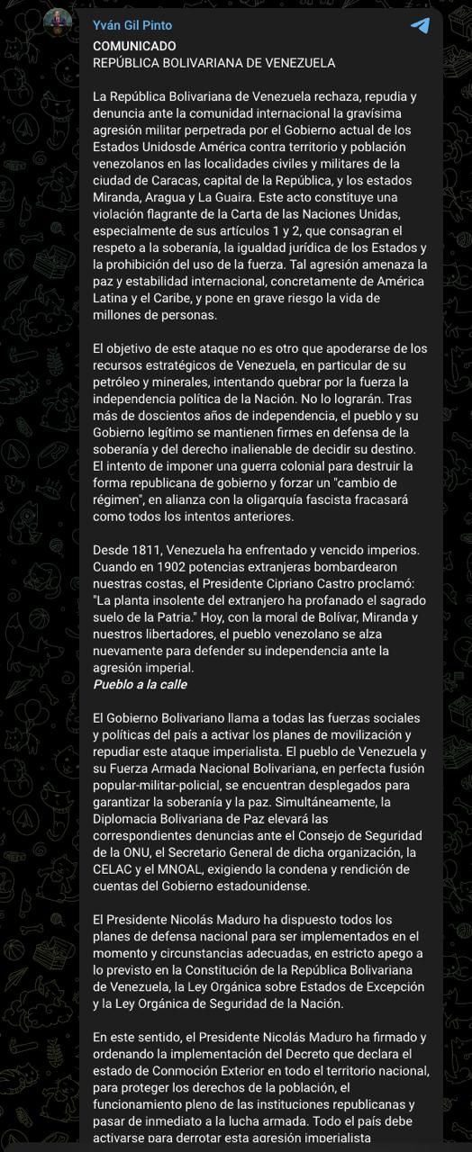 "Целью этой атаки является захват стратегических ресурсов Венесуэлы, в частности ее нефти и полезных ископаемых, с целью насильственного подрыва политической независимости страны. Этого им не удастся добиться. После более чем двухсот лет независимости народ и его законное правительство остаются непоколебимыми в защите суверенитета и неотъемлемого права определять свою судьбу", - добавил глава МИД.