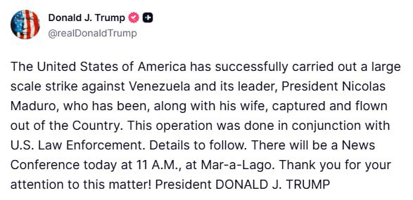 "Соединенные Штаты Америки успешно провели широкомасштабную операцию против Венесуэлы и её лидера, президента Николаса Мадуро, который вместе со своей женой был захвачен и вывезен из страны. Эта операция была проведена совместно с правоохранительными органами США. Подробности будут сообщены позже. Сегодня в 11:00 (в 18:00 по Киеву - Ред.) в Мар-а-Лаго состоится пресс-конференция. Благодарим вас за внимание к этому вопросу!" – написал Трамп.