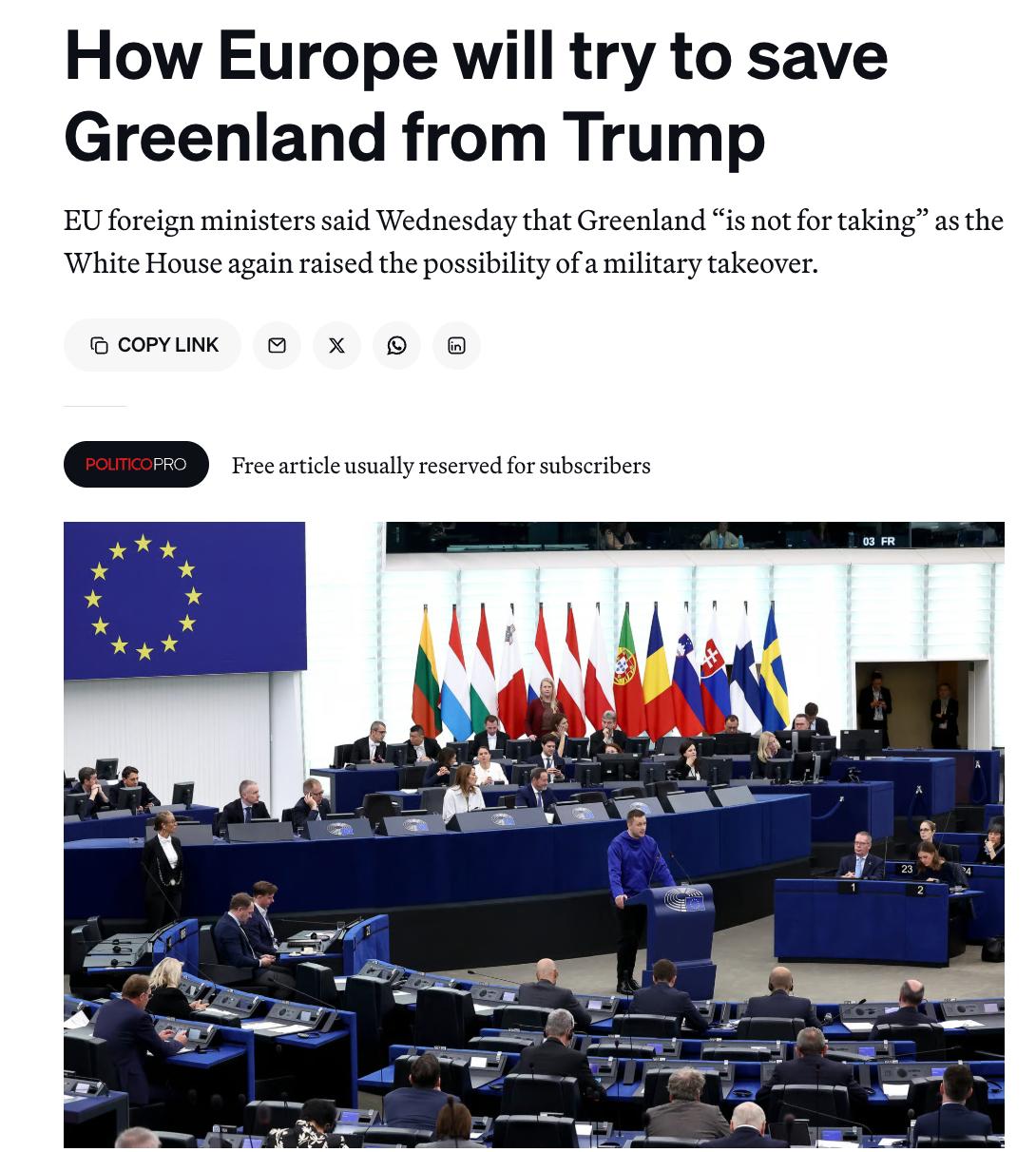 Politico описывает четыре варианта действий, которые Европа может предпринять, чтобы помешать аннексии Гренландии.