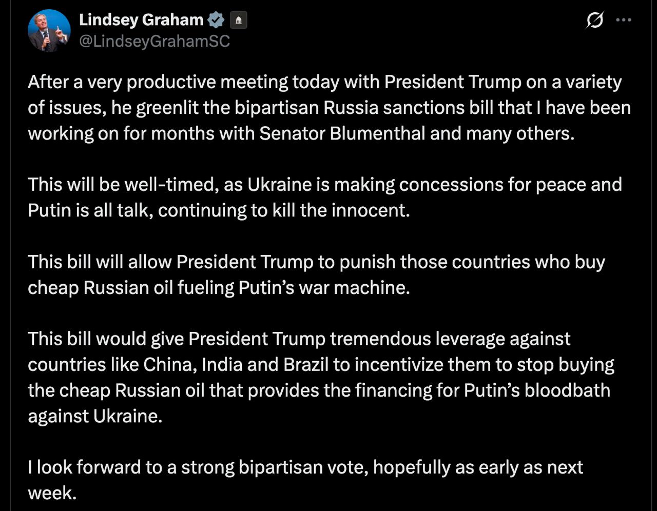 Грэм заявил, что инициатива даст Трампу "огромные рычаги давления" на такие страны, как Китай, Индия и Бразилия, чтобы побудить их отказаться от закупок российской нефти. Он рассчитывает на двухпартийное голосование и допускает, что оно может состояться уже на следующей неделе.