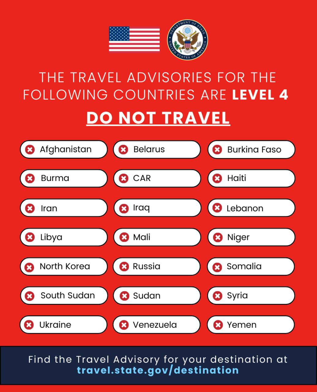 В список стран с самым высоким уровнем опасности также входят Афганистан, Буркина-Фасо, Мьянма, Центральноафриканская Республика, Гаити, Иран, Ирак, Ливан, Ливия, Мали, Нигер, КНДР, Сомали, Южный Судан, Судан, Сирия, Венесуэла и Йемен.