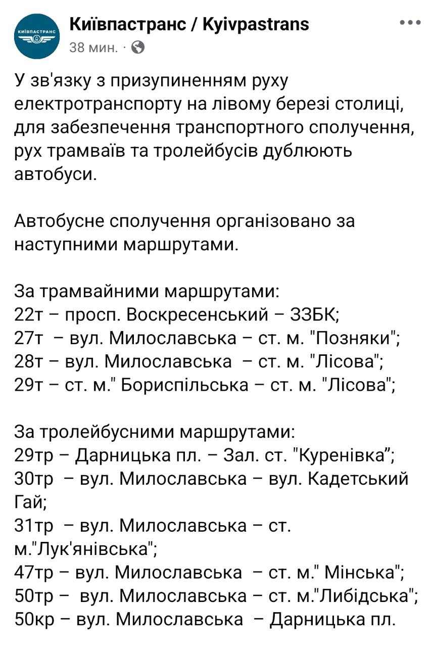 "Киевпасстранс" заявил, что весь электротранспорт, курсирующий на левом берегу Киева, временно не будет работать.