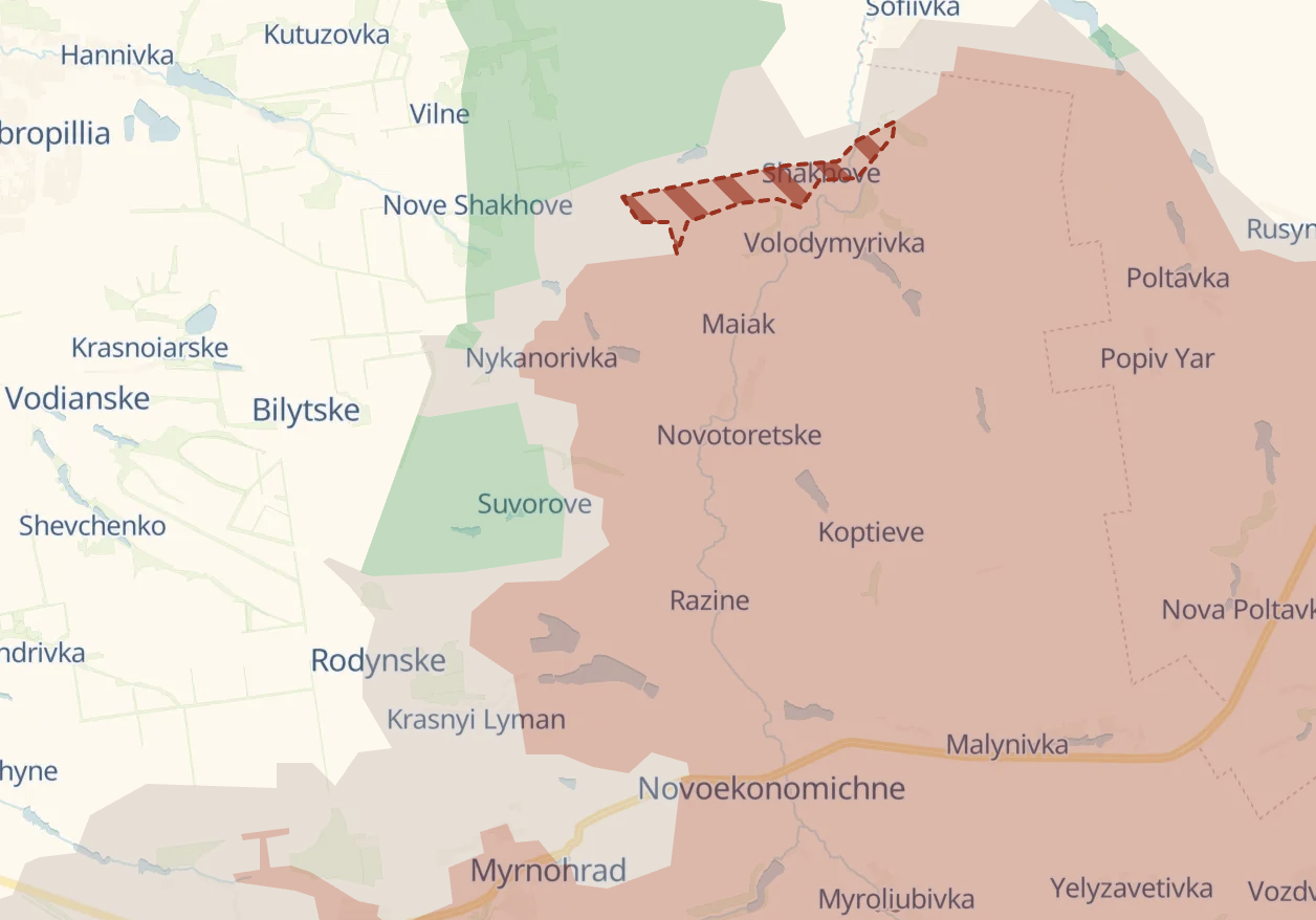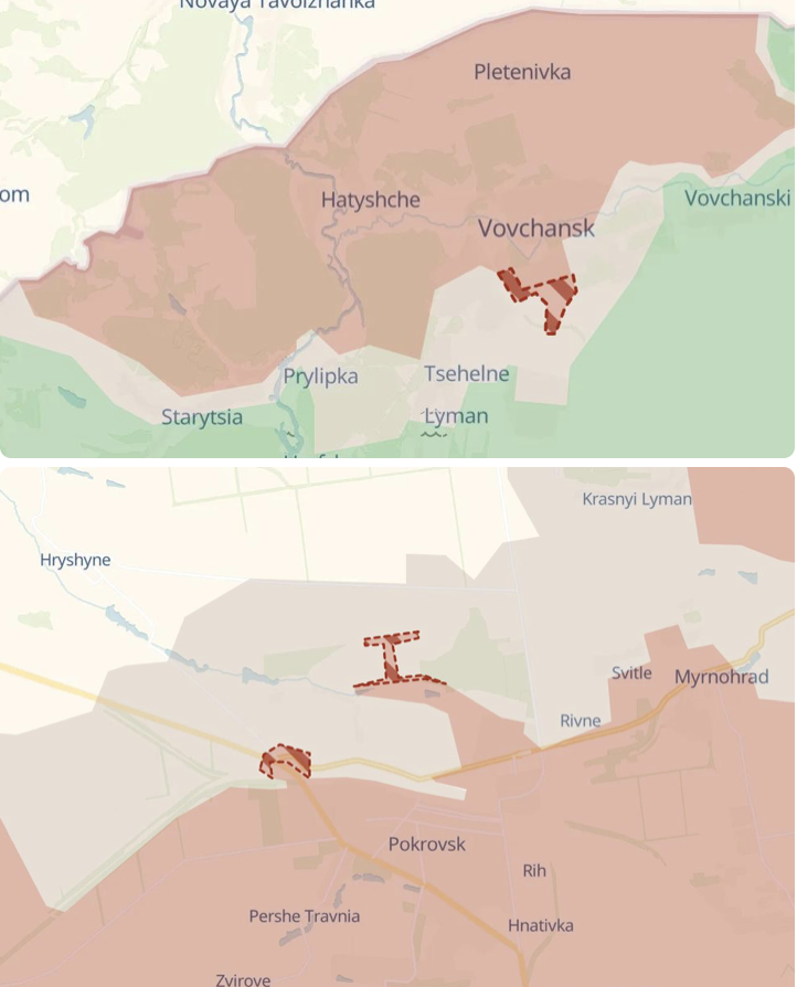 Российские войска продвинулись в районе Волчанска и в Покровске, сообщает военный паблик Deep State. К северу от Мирнограда они продвинулись в районе Шахово.