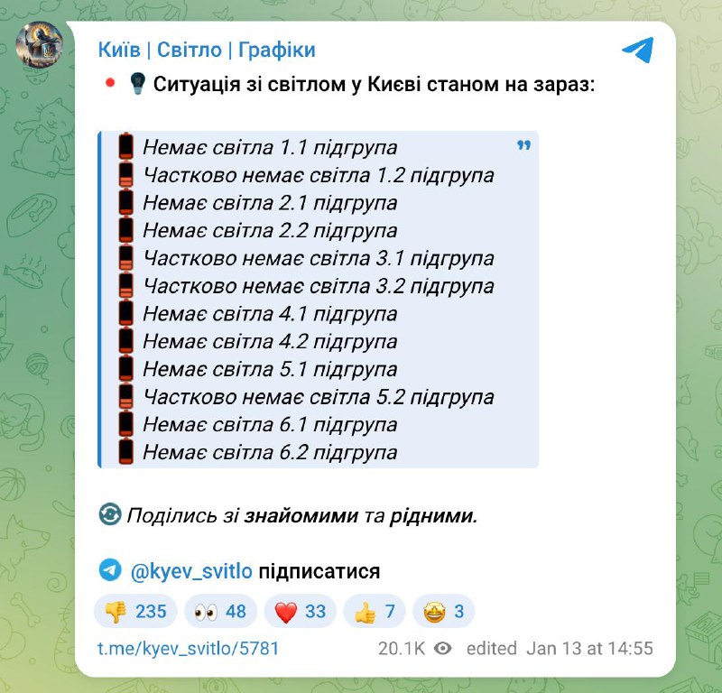Например, у подгруппы 2.2 свет за последние 14 часов дали на полтора часа - с полуночи до 1:30. Затем начались аварийные отключения и свет пропал, восстановить свет обещают к полуночи 14 января.