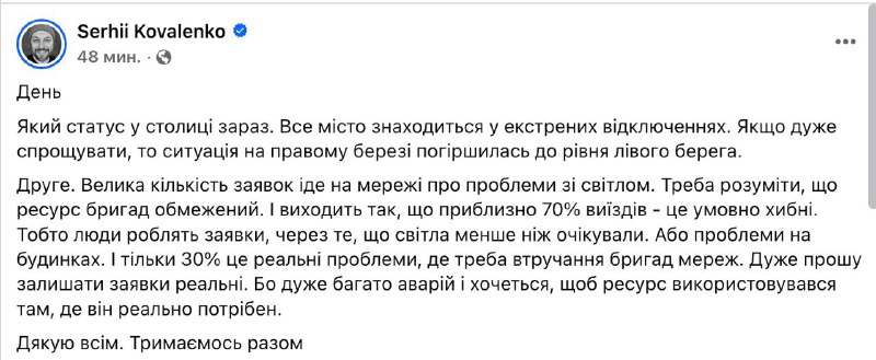 17.16 Ситуация со светом на правом берегу Киева ухудшилась до уровня, который до сегодняшней ночи был на левом берегу, сообщил гендиректор Yasno Коваленко.