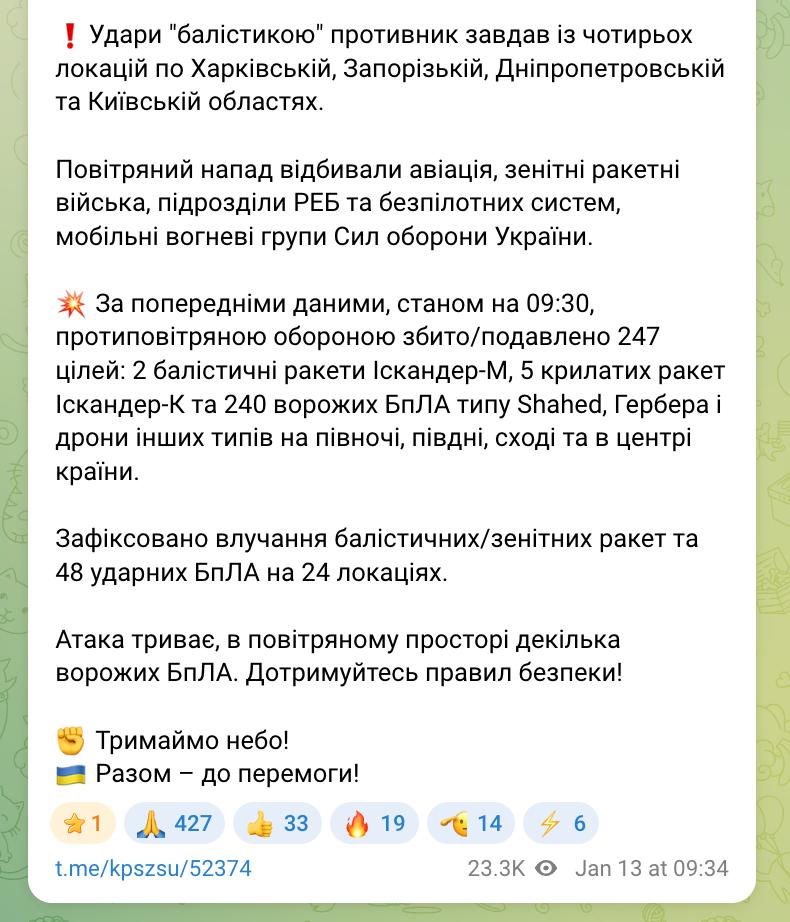 Во вторник, 13 января, в Украине идет 1420-й день войны с Россией. После ночных ударов по объектам энергетики почти весь Киев остался без света.
