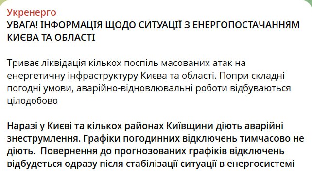 11.36 Ночью были прилеты по объектам энергетики в ряде регионов, из-за чего начались отключения света в Киеве, Киевской, Одесской, Харьковской, Днепропетровской, Донецкой, Черниговской и Запорожской областях, сообщает Минэнерго. Сетевые ограничения применяются в Киеве, Днепре, Киевской и Одесской областях, графики там не действуют.