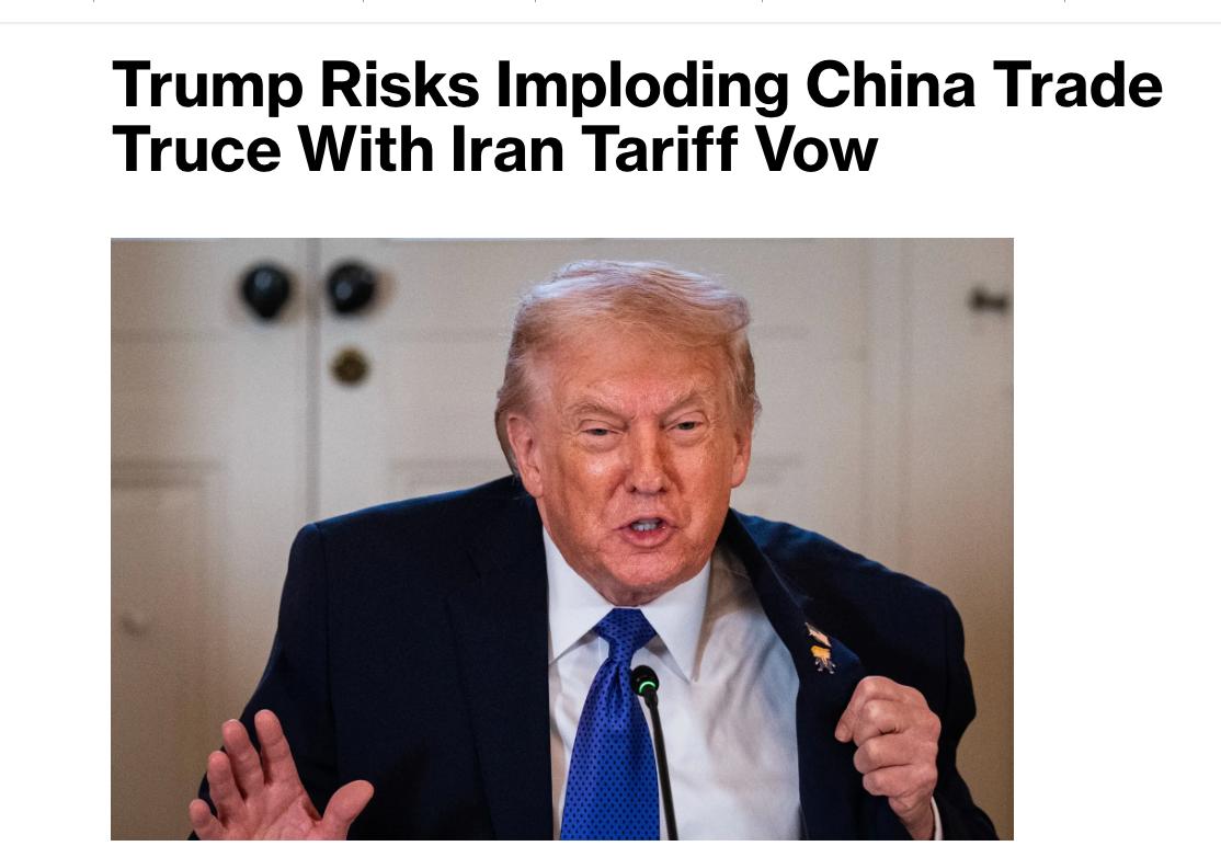 Заявление президента США Дональда Трампа о новых тарифах для стран, торгующих с Ираном, может поставить под угрозу торговое перемирие США и Китая, заключенное год назад.
