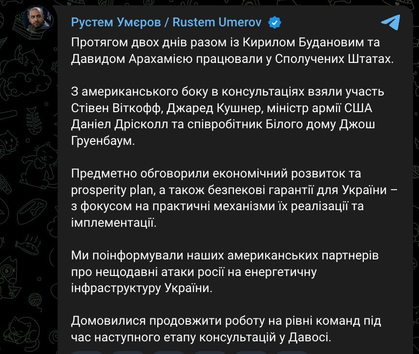 "Предметно обсудили экономическое развитие и план процветания (prosperity plan), а также гарантии безопасности для Украины - с фокусом на практические механизмы их реализации и имплементации… Договорились продолжить работу на уровне команд на следующем этапе консультаций в Давосе", - заявил секретарь СНБО.