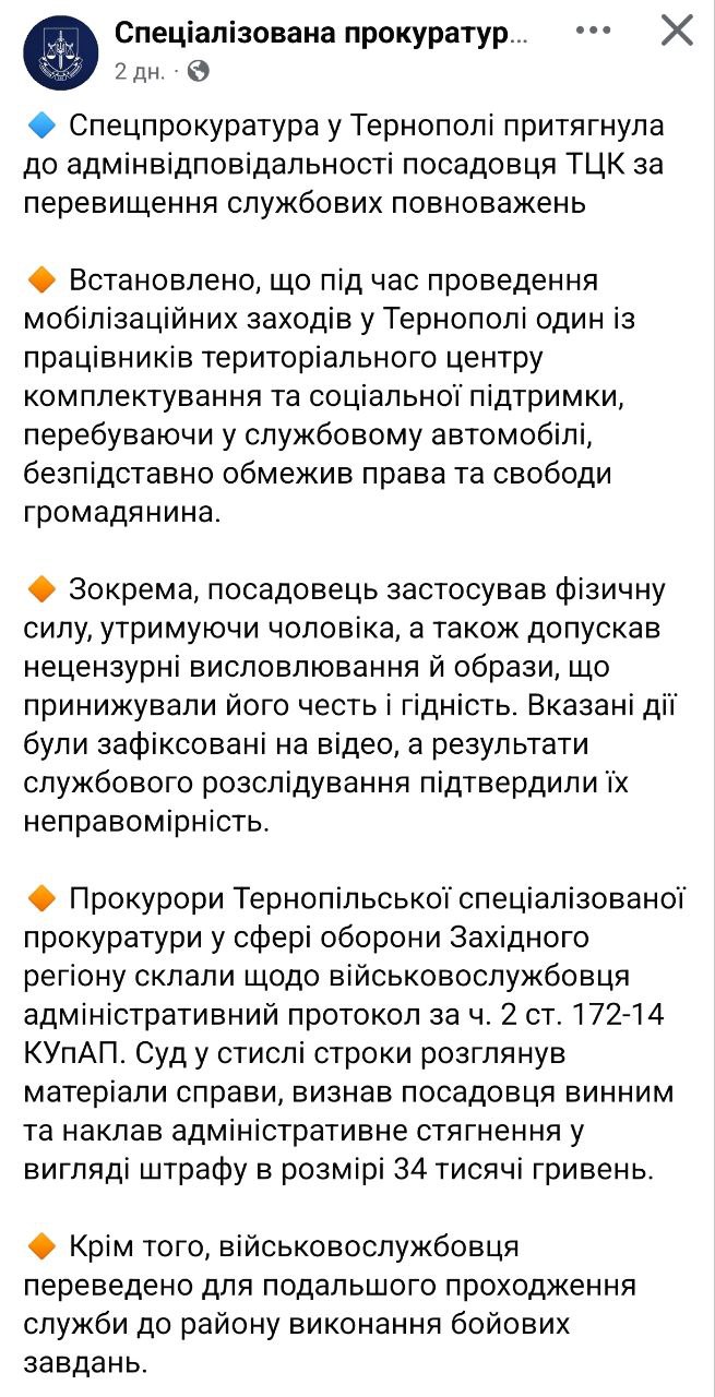 8:09 В Тернополе сотрудника ТЦК оштрафовали и отправили на фронт за превышение полномочий.