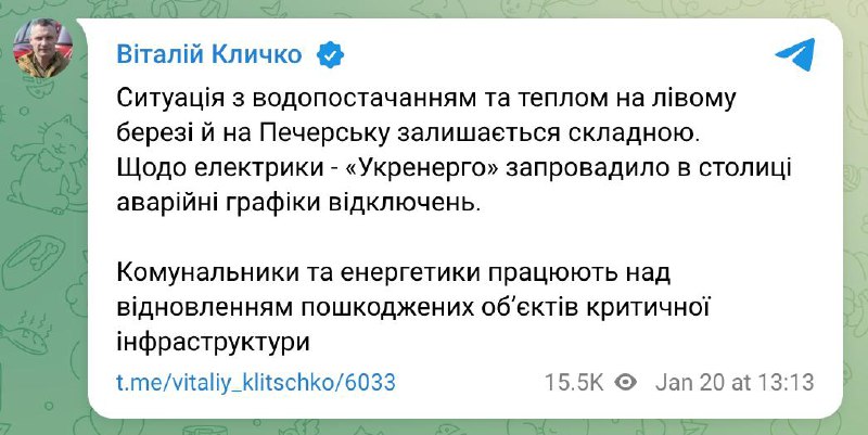 13.25 Ситуация с водоснабжением и теплом на левом берегу Киева и Печерске остается сложной, заявил мэр Кличко.