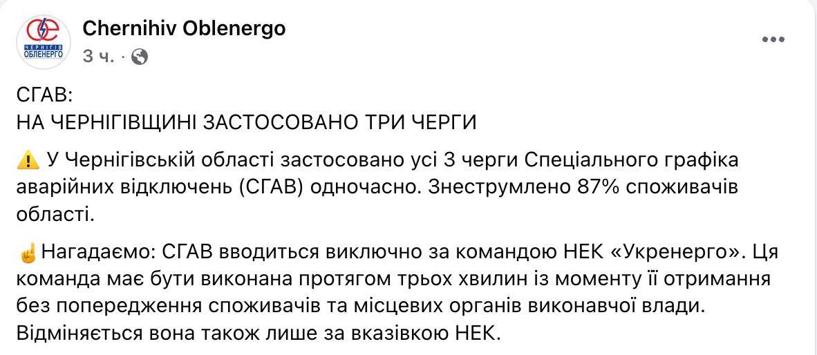 18.01 87% Черниговской области без света, сообщает облэнерго.