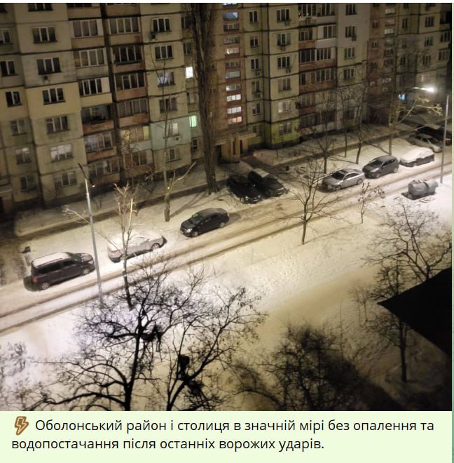16.53 О ситуации на левом берегу Киева рассказывает житель Позняков: "Света, воды и отопления нет. Батареи леденеют, и в квартирах холодно. А ещё пропала связь. Голосовая связь ещё волнами пробивается, а вот мобильного интернета тотально нет. Хором с соседями пытались дозвониться в "Киевстар", но это невозможно: постоянно гоняет по голосовому меню, а потом сбрасывает, заявляя, что нет свободных консультантов. Так уже несколько часов. Плохой признак: значит, много у кого проблемы и клиенты массово звонят".