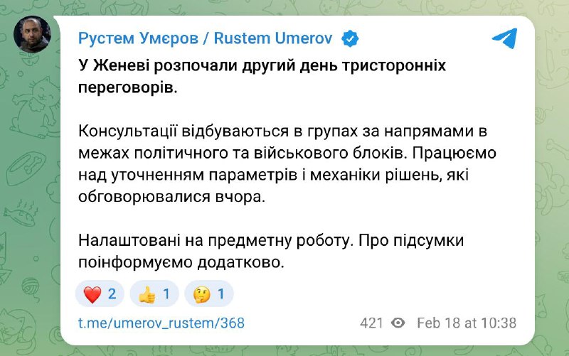 10.41 Начался второй раунд переговоров делегаций Украины, США и РФ в Женеве, сообщил Умеров.