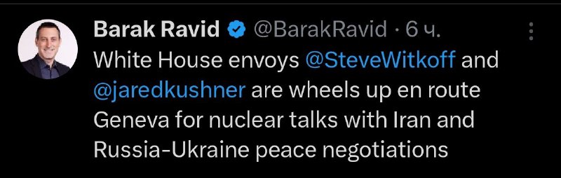 07:50 Представители Трампа Уиткофф и Кушнер вылетели в Женеву для переговоров с делегациями России и Украины. Об этом сообщил журналист Axios Барак Равид.