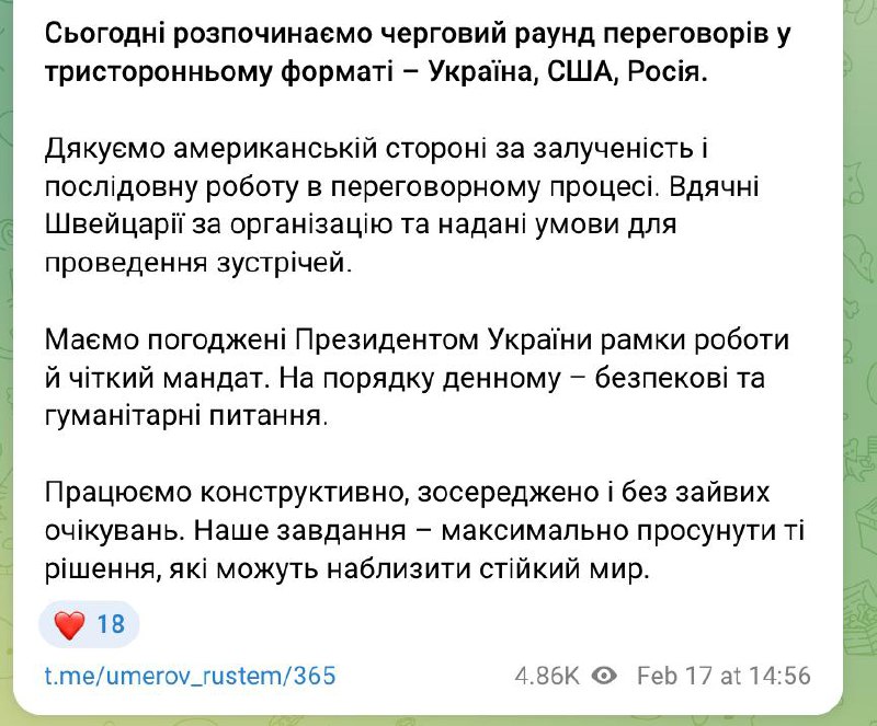"В Женеве завершился первый день трехсторонних переговоров. После совместной части продолжили работу в группах по направлениям. Обсуждения были сосредоточены на практических вопросах и механике возможных решений. На сегодняшний день и политический, и военный блоки завершили работу. Благодарим американских партнеров за конструктивное взаимодействие и готовность работать в рабочем темпе. О результатах первого дня переговоров в Женеве будет доклад президенту Украины. Завтра с утра политическая и военная группы продолжат работу", – написал он.