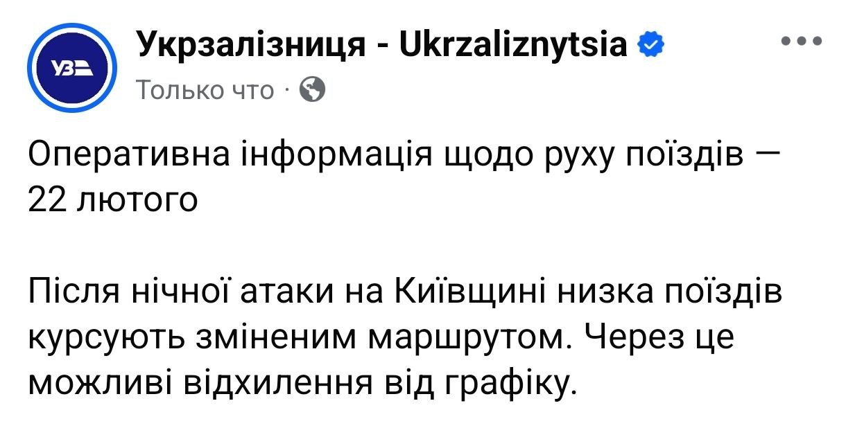 9:24 Из-за ночных прилётов поезда в Киевской области иду с опозданием, сообщила "Укрзализныця".