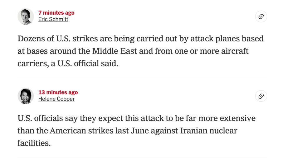 "Десятки американских ударов наносятся штурмовиками, базирующимися по всему Ближнему Востоку, а также с одного или нескольких авианосцев, сообщил американский чиновник. Американские официальные лица заявляют, что эта атака будет гораздо масштабнее, чем американские удары по иранским ядерным объектам в июне прошлого года", - пишет газета.